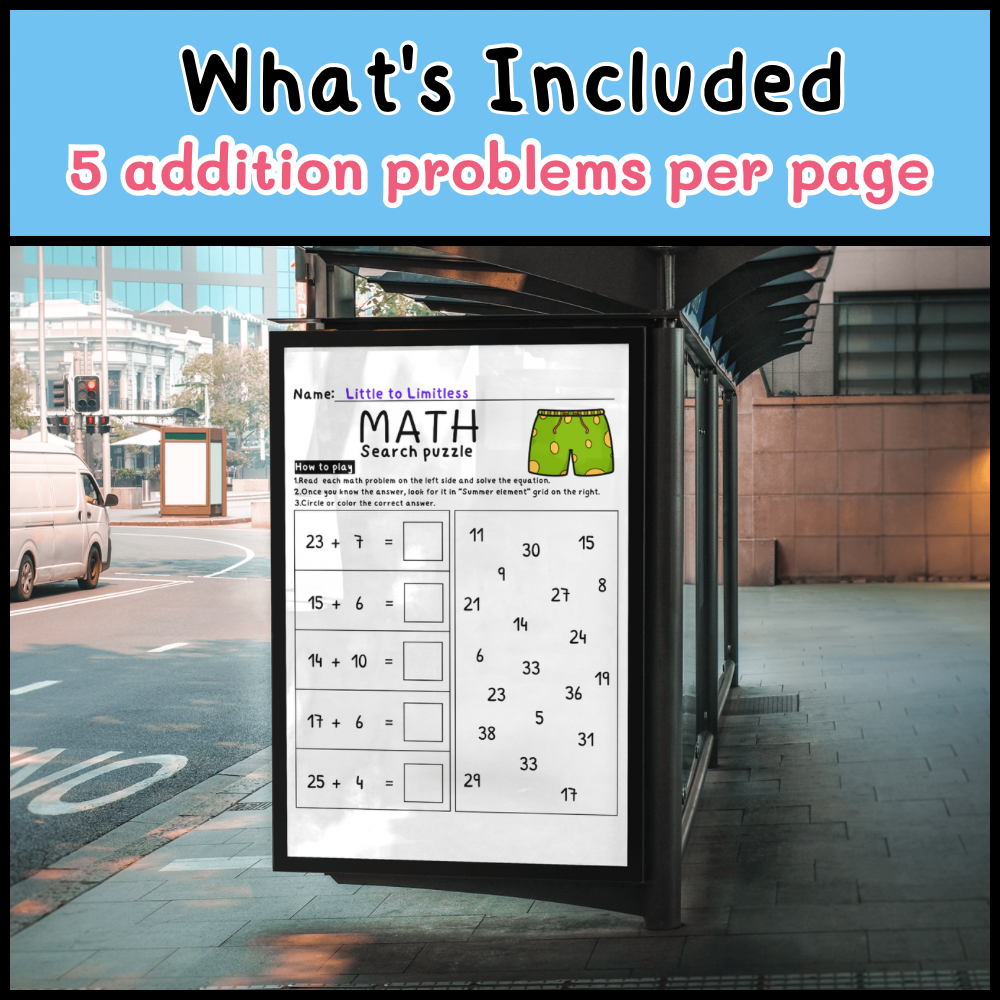 Designed for Kindergarten, 1st Grade, and 2nd Grade students, this set includes 10 fun addition worksheets featuring 5 addition problems per page and a number search puzzle.